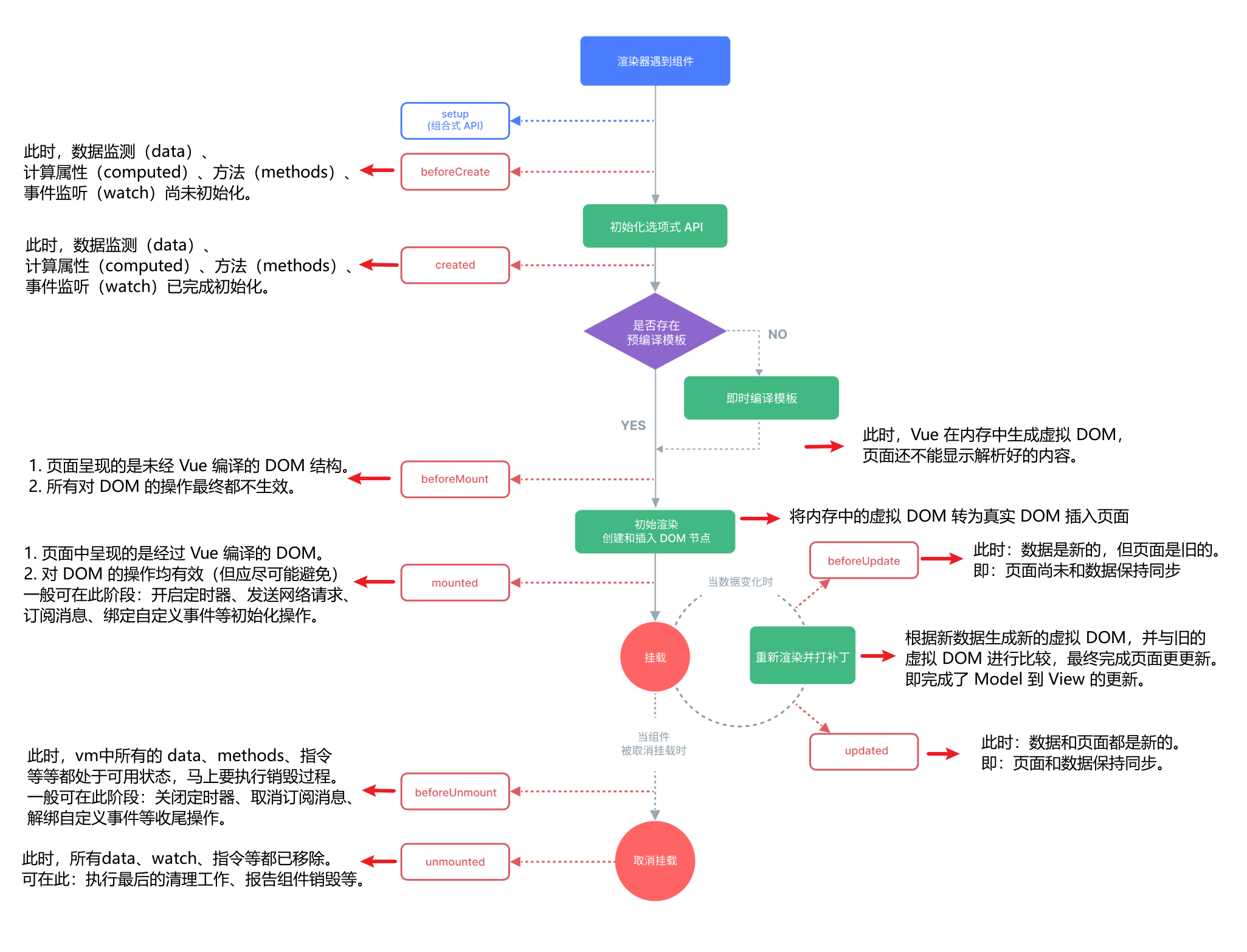 上图中是选项式API的生命周期钩子函数,组合式API的生命周期钩子函数(下表红色字体)总是比选项式先调用。